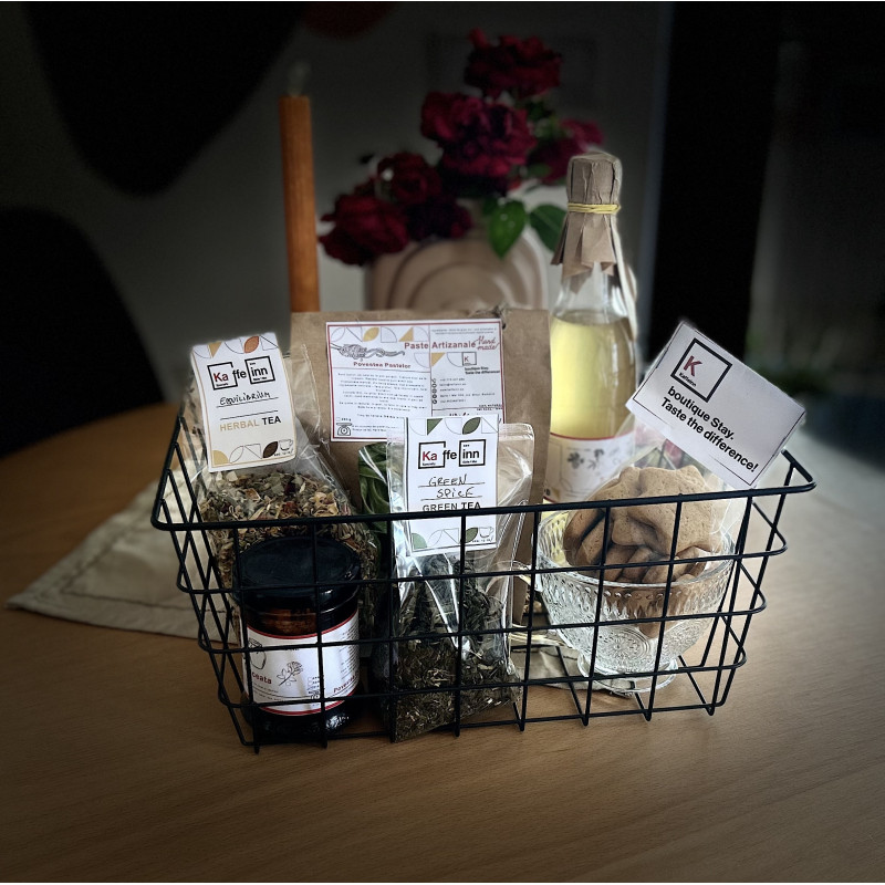 Ingrediente: 1 x dulceata de nuci verzi/trandafir, 1 x ceasca ceai, 2 X ceai de specialitate in diferite combinatii, 1 x punga paste artizanale, 1 pachet turta dulce naturala hand made